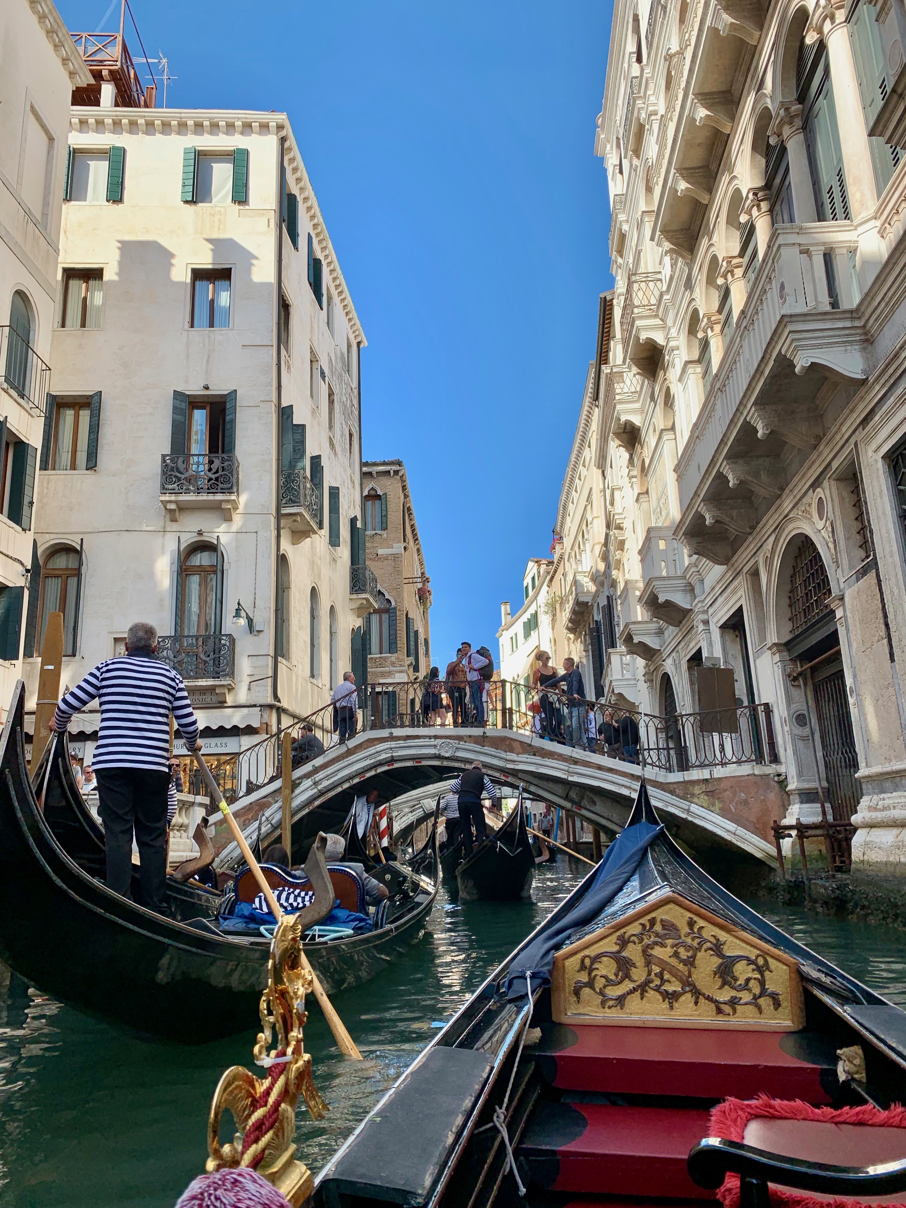 A visit to Venice would not be complete without a gondola ride down the canal; we picked up a gondolier from outside Doge’s Palace and sailed silently under the Bridge of Sighs and entered the inner city canals. How we didn’t tip out numerous times or hit various other gondola’s I still do not know, it was a bucket-list experience for me and didn’t disappoint! As this was our last time in Italy, we made the most of the cheap espresso and gelato opportunities on the walk home before finishing off the day in classic Italian fashion – homemade Aperol Spritz in Big Karl.